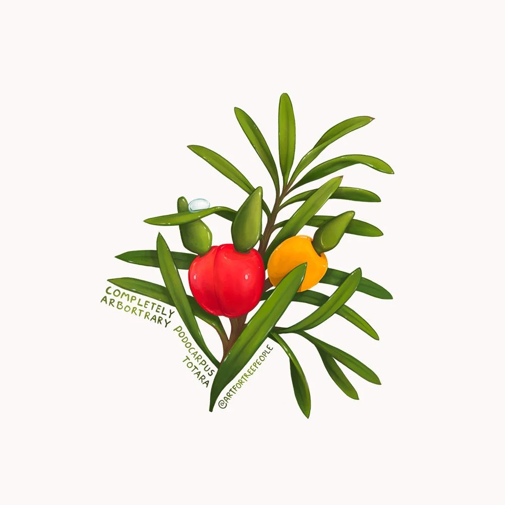 Tōtara is a massive forest tree endemic to New Zealand. It’s the largest tree of the Podocarpaceae, reaching over 42 m (140 ft) tall. Being a podocarp, it doesn’t grow woody cones like other conifers. Instead, to compete with angiosperms, tōtaras reduced their cones to just a few scales that become brightly colored and succulent with a single seed poised on top. They’re undeniably tasty to birds which disperse their seeds, and which have played an outsized role in the evolution of plants on the long-isolated islands.